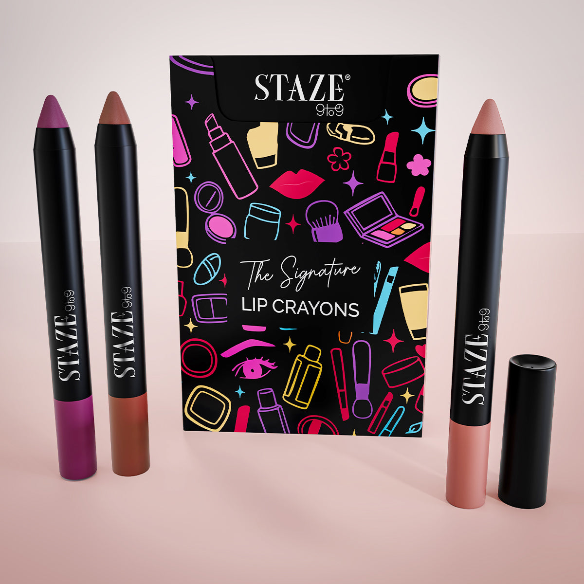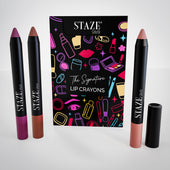 Introducing the Staze 9to9 The Signature Lip Crayons Lipstick Set: three matte lip crayons in brown-girl-friendly shades that flatter every pout & every mood. The buttery-smooth formula glides on effortlessly, delivering bold pigment with comfortable, all-day wear. Infused with Vitamin E and Jojoba Oil, each crayon keeps your lips soft, nourished, and never dry - so you get color that cares as much as it slays. Whether it’s a thoughtful gift for your mom, sister, or bestie (or a well-deserved treat for yourself), this set is love at first swipe.